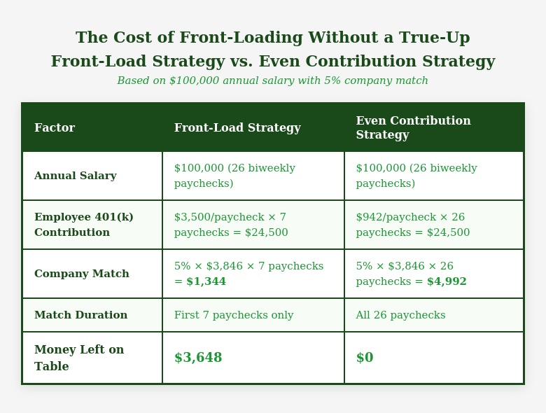 Bottom line: Never front-load your 401(k) without first confirming your company’s match policy. A single conversation with HR can save you thousands of dollars.
